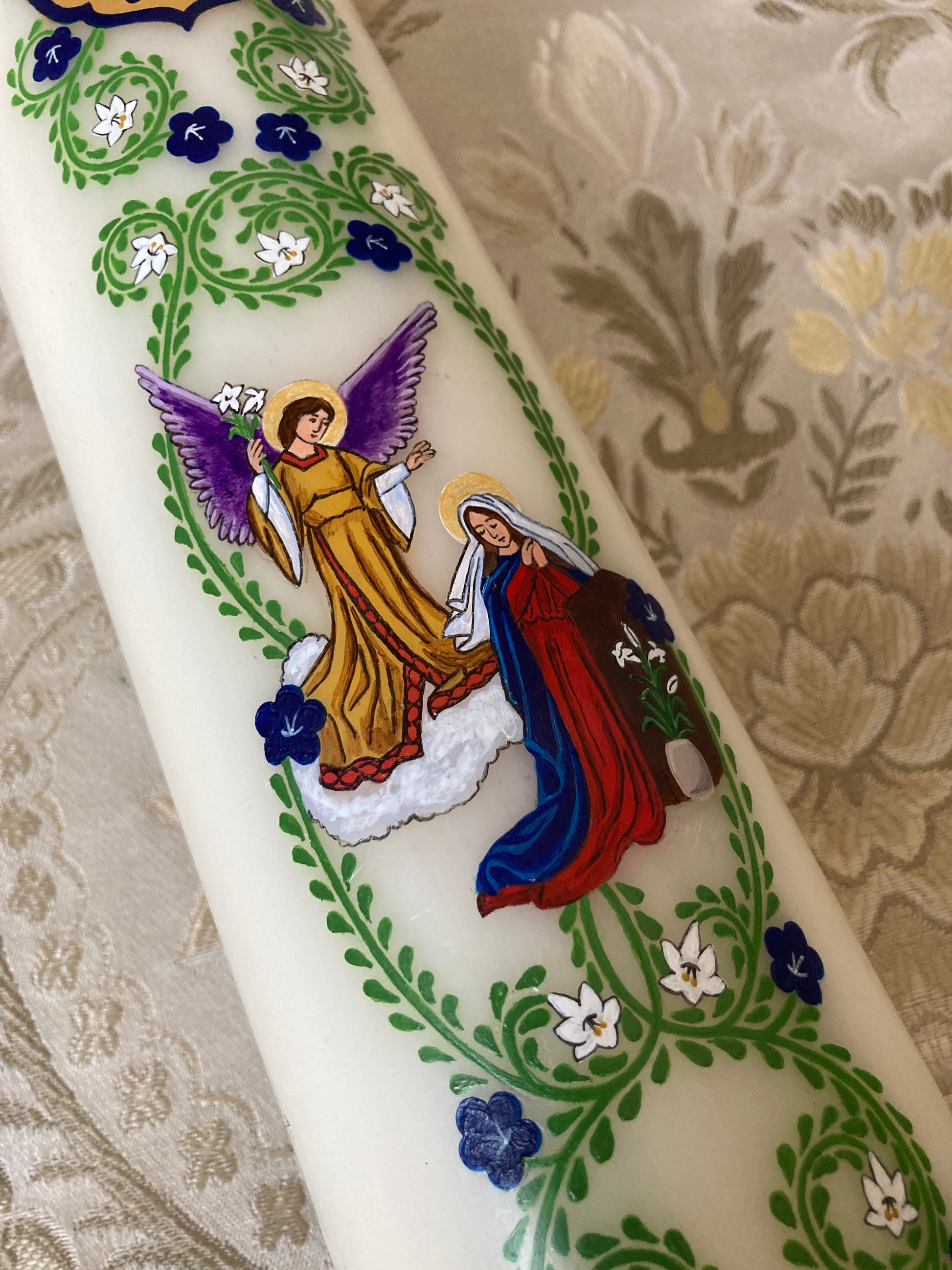 This is my original design, hand-painted with acrylic paints on a 51% beeswax candle. For this candle, I wanted to design something uniquely Marian, reflecting on Our Blessed Mother's joy over her Son's Resurrection. The Madonna and Child I chose for the sample candle is inspired by a medieval manuscript, but I can paint any title of Our Lady on this design, depending on your preference. The last four photos offer some examples of this.