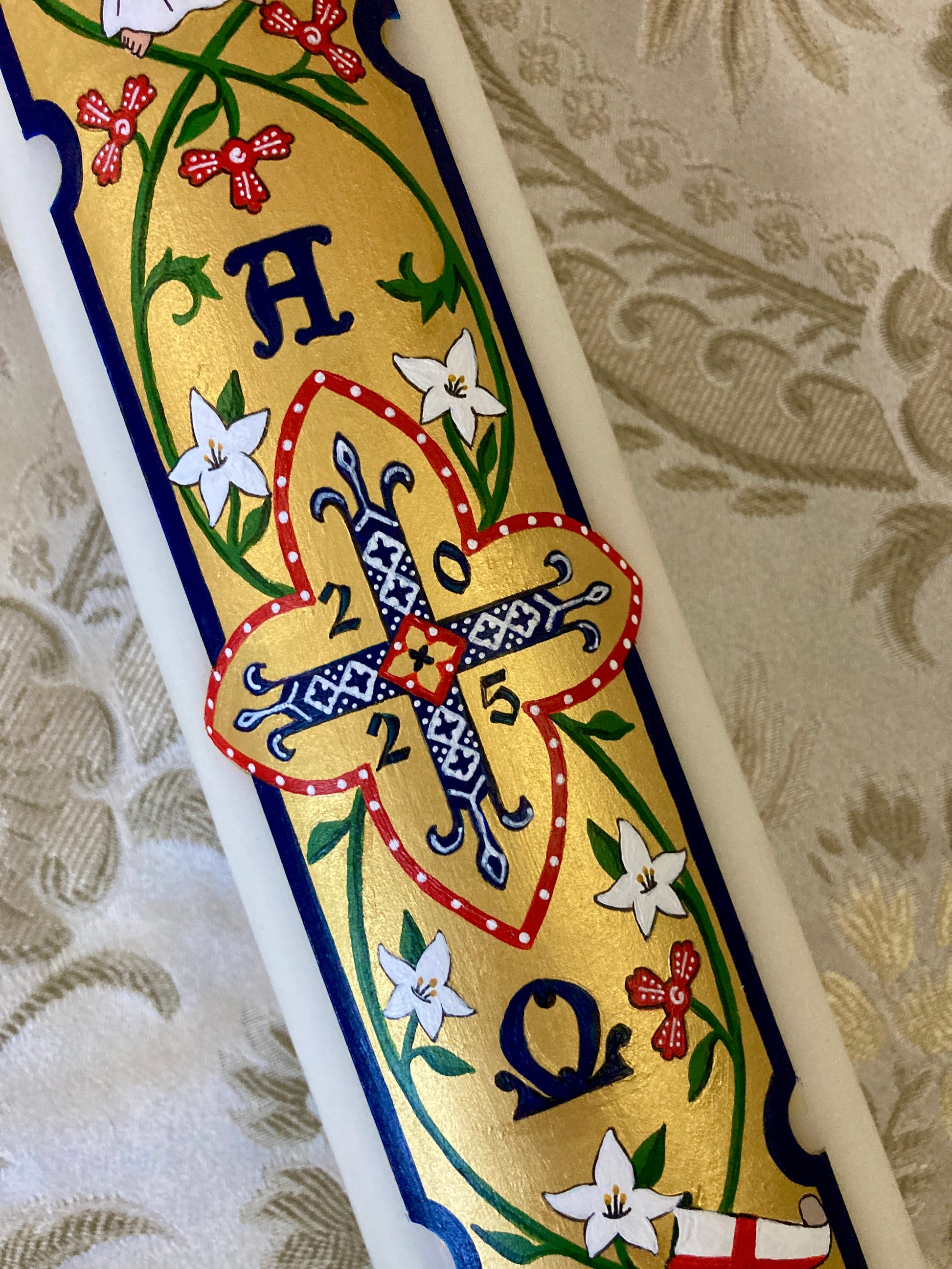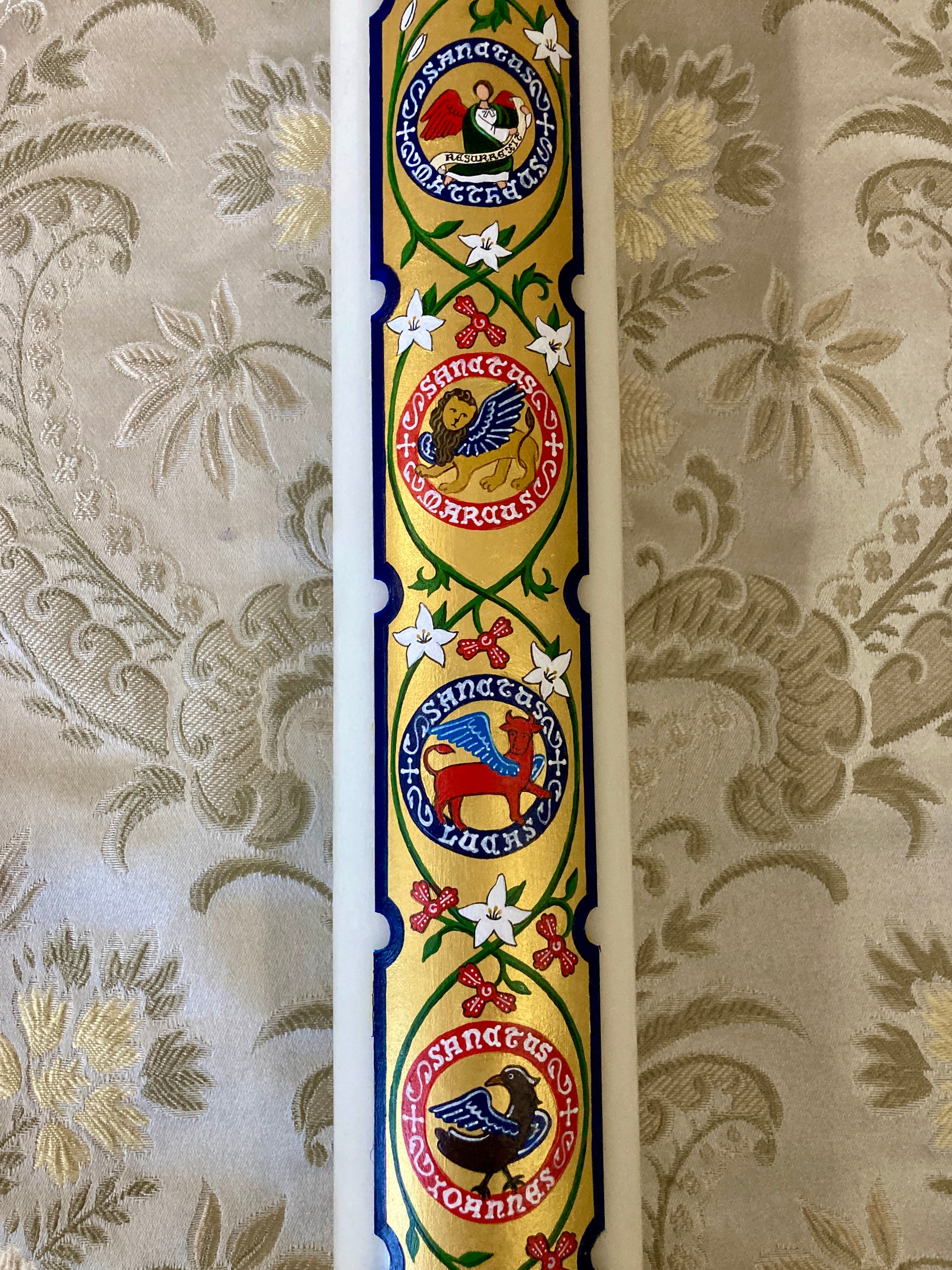 The basic design includes the Cross, Alpha & Omega, the Lamb of God, the Four Winged Beasts, and two angels holding "Alleluia" scrolls. To this, I can add whatever saints, scenes, or symbols you request. (If there is not enough room on your candle, the angels and/or the beasts will be replaced by your customisations.)