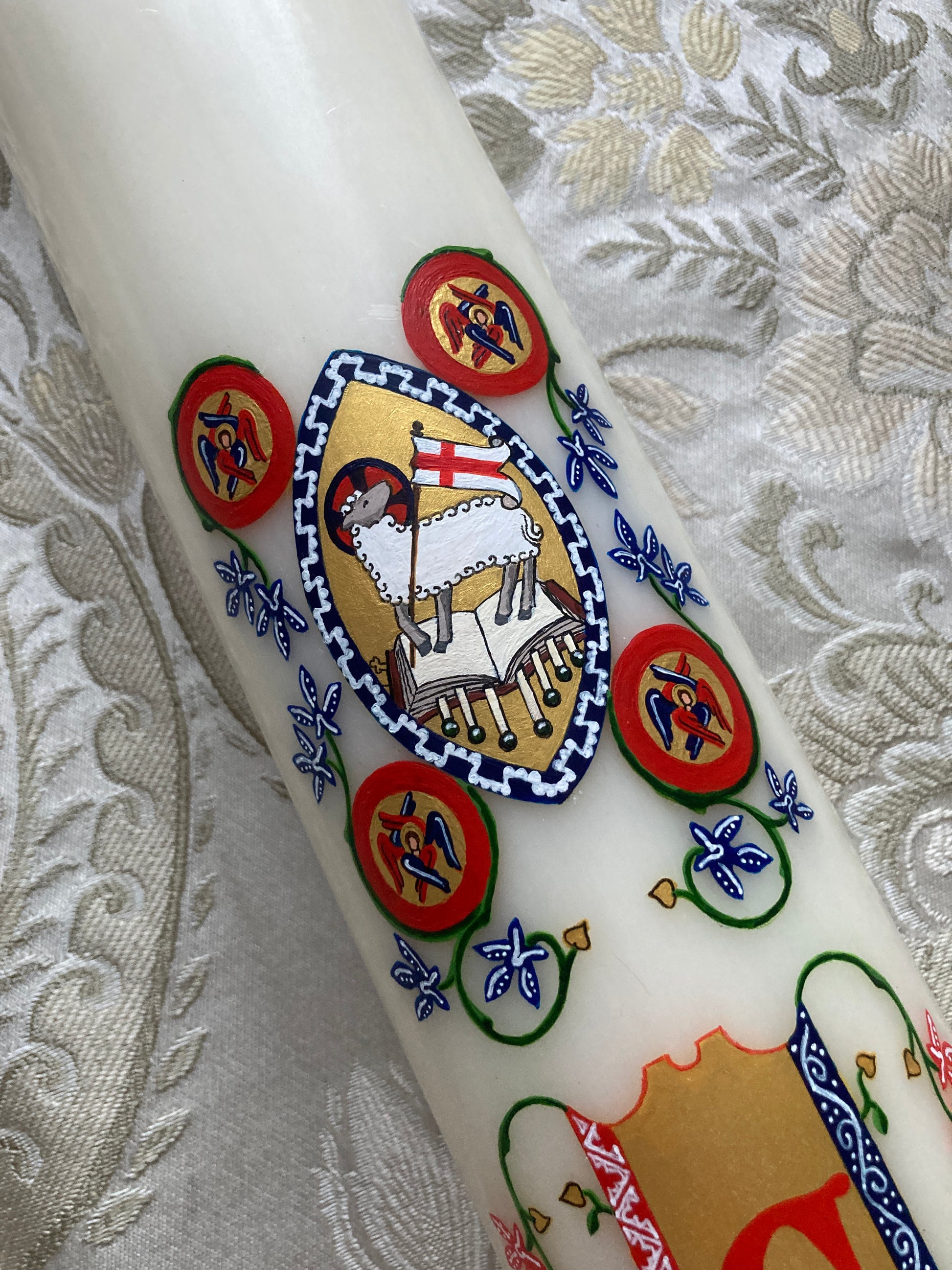 This is my original design, hand-painted with acrylic paints on a 51% beeswax candle. We wanted to create a Paschal Candle that looks very similar to an actual manuscript page from the 14th century. The theme of this candle is Christ in Majesty. This is a beautiful and important image of Christ in Sacred Art which was especially popular in the Middle Ages. Christ is depicted enthroned within a mandorla (which is a symbol of heavenly glory) with the world beneath His feet. His right hand is raised in blessing, and His left hand holds an open book. We thought it would be beautiful to use this candle to depict Christ as both our King in Glory and the spotless Lamb who was slain for our salvation.